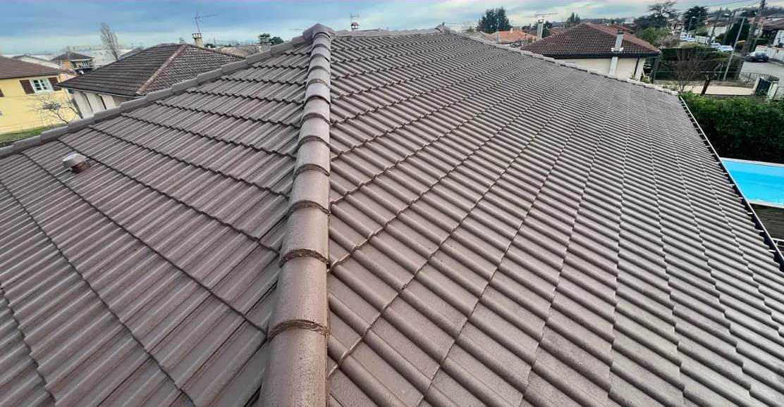 Résine colorée sur toiture. Nettoyage, réparation et remise en résine toiture avec traitement hydrofuge.